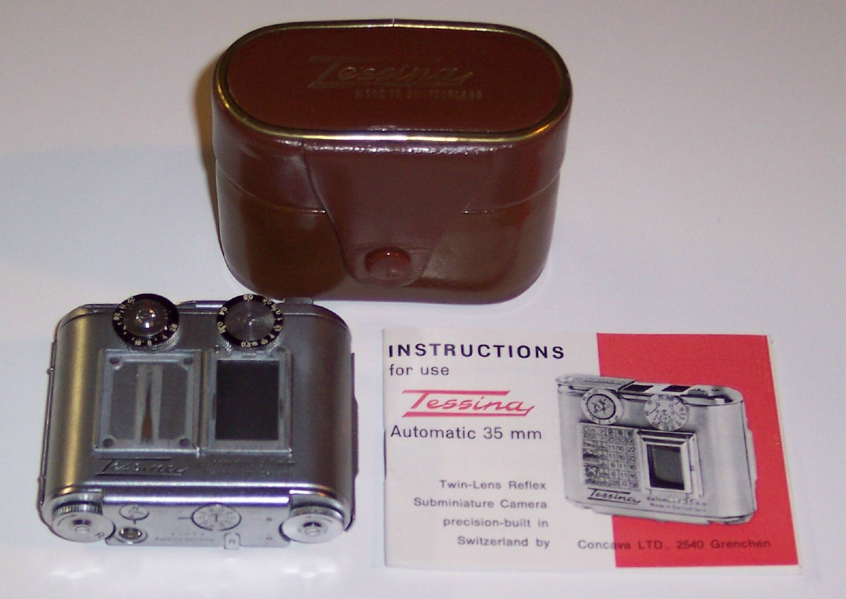 Tessina Automatic 35mm. | De haute-gamme et fabriqué en Suisse entre les années 1960 et 1996, cet appareil-photo était facilement dissimulé. Décrit dans le livre de Keith Melton "Le Parfait Espion" (édition 1997) à la page 62 incluant une photo d'une Tessina cachée dans un livre. | Autres photos des modèles Tessina: |