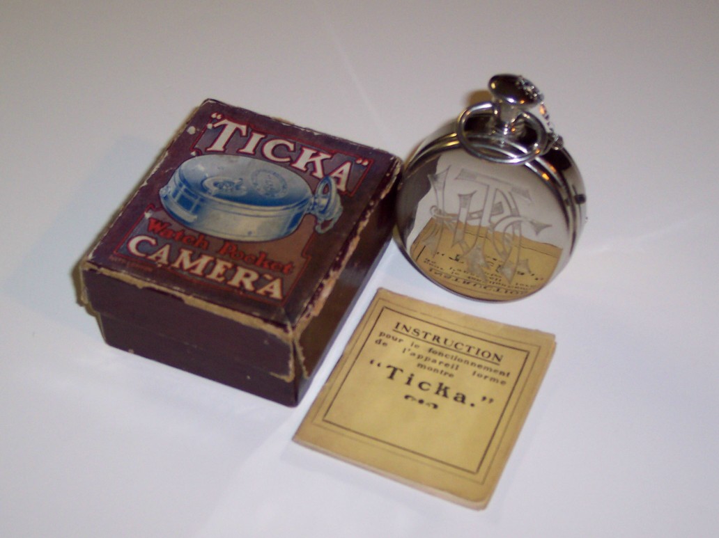 La caméra Ticka fut produite avec une allure d'une montre de poche par la compagnie britannique Houghton. Cette caméra venait dans une petite boîte et une notice. | Produite environ 1904-1910 - une autre caméra (l'Expo) était très semblable à la Ticka.