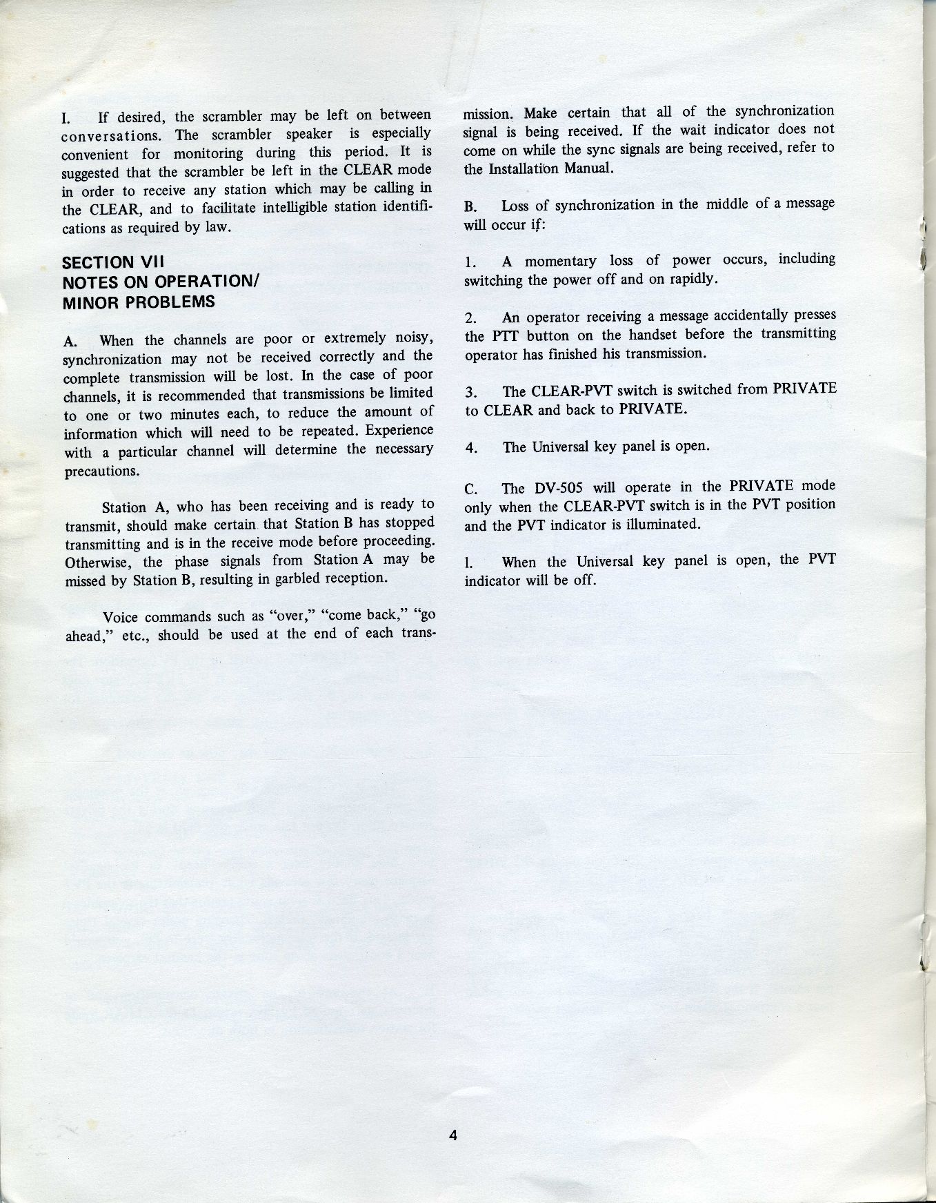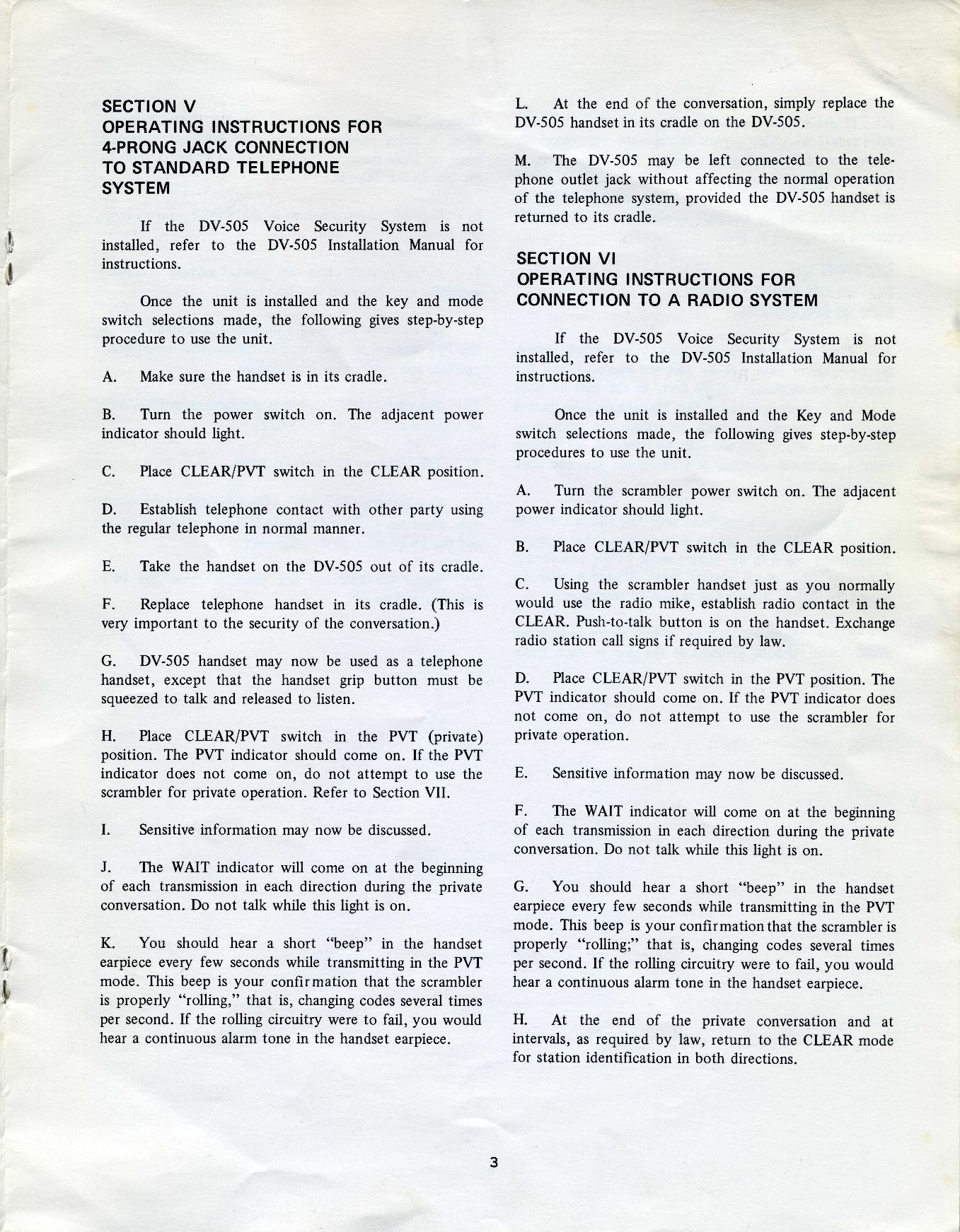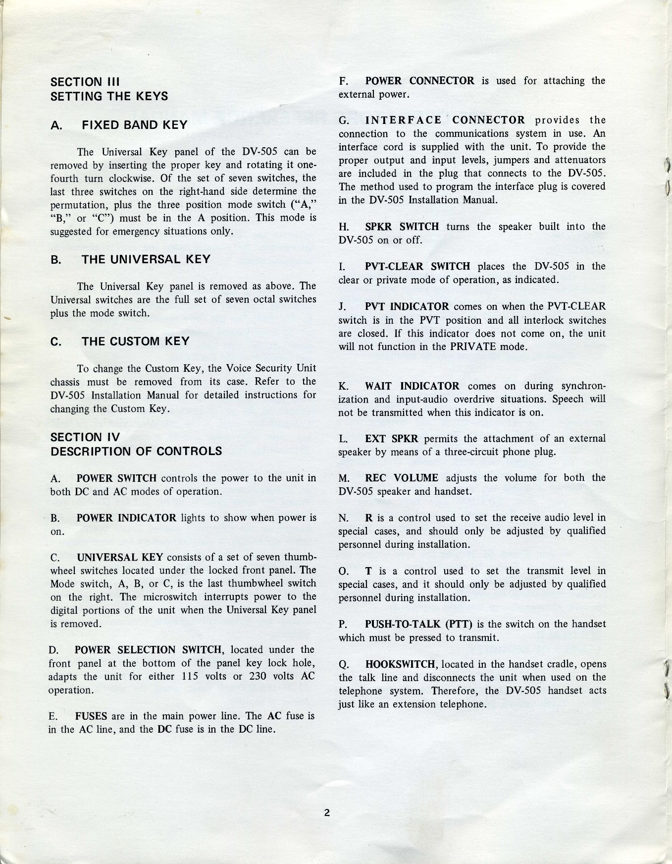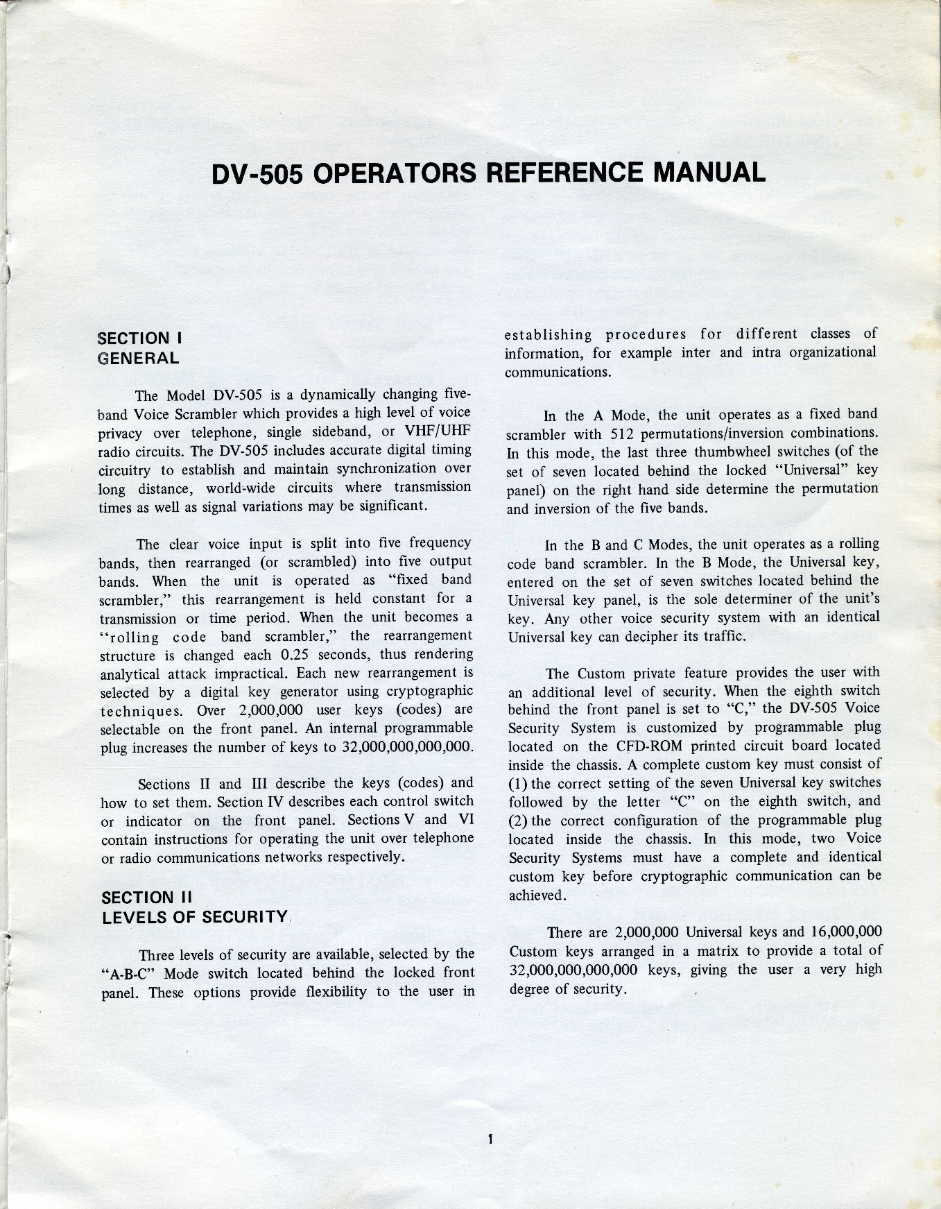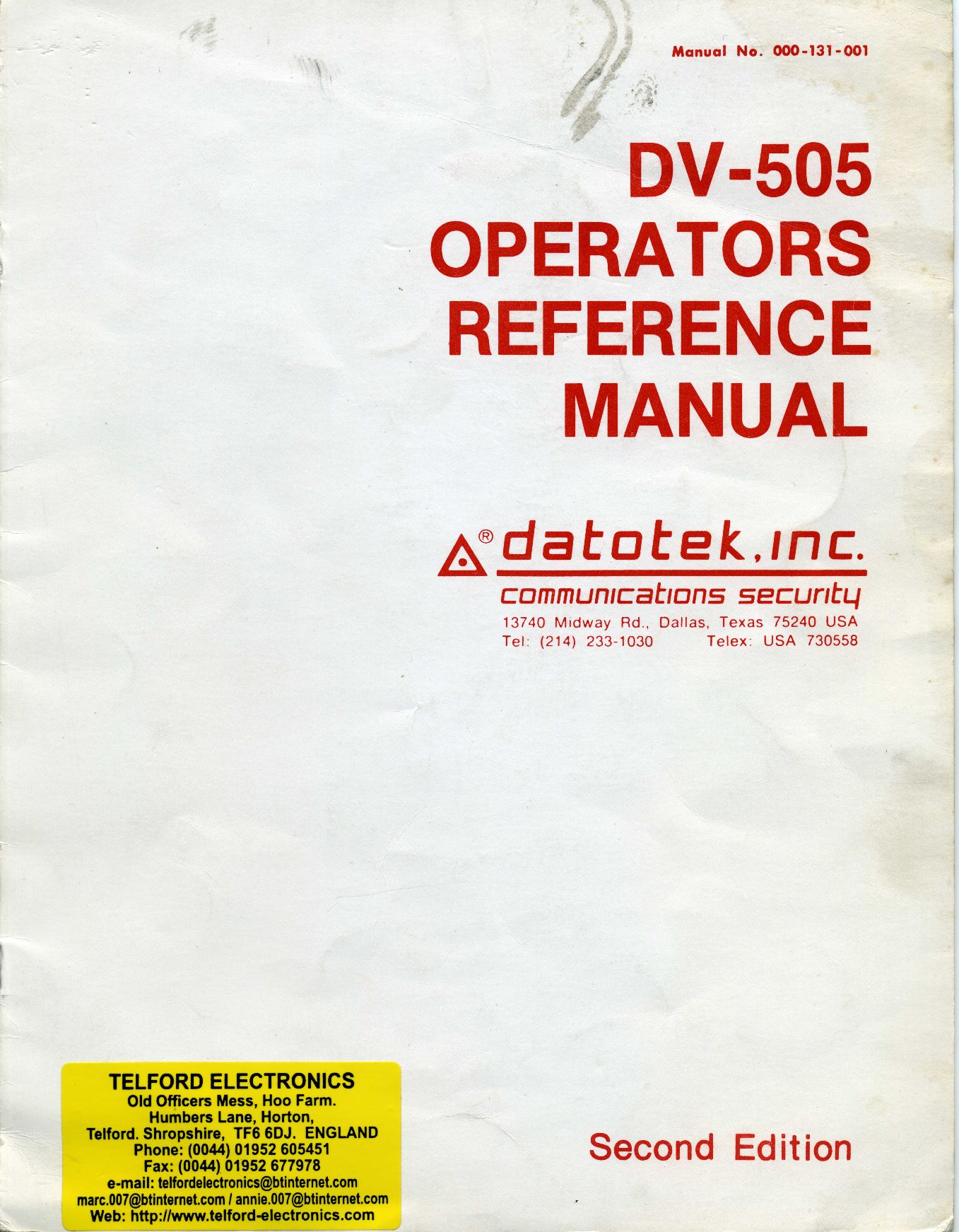 Here is a scan of the few pages of the "DV-505 Operators Reference Manual" (the back cover does show a publication date of 1976): The above has been shared with www.cryptomuseum.com and they've integrated the scanned pages into a PDF. | Please click on this www.cryptomuseum.com webpage for additional background information to the Datotek DV-505. |