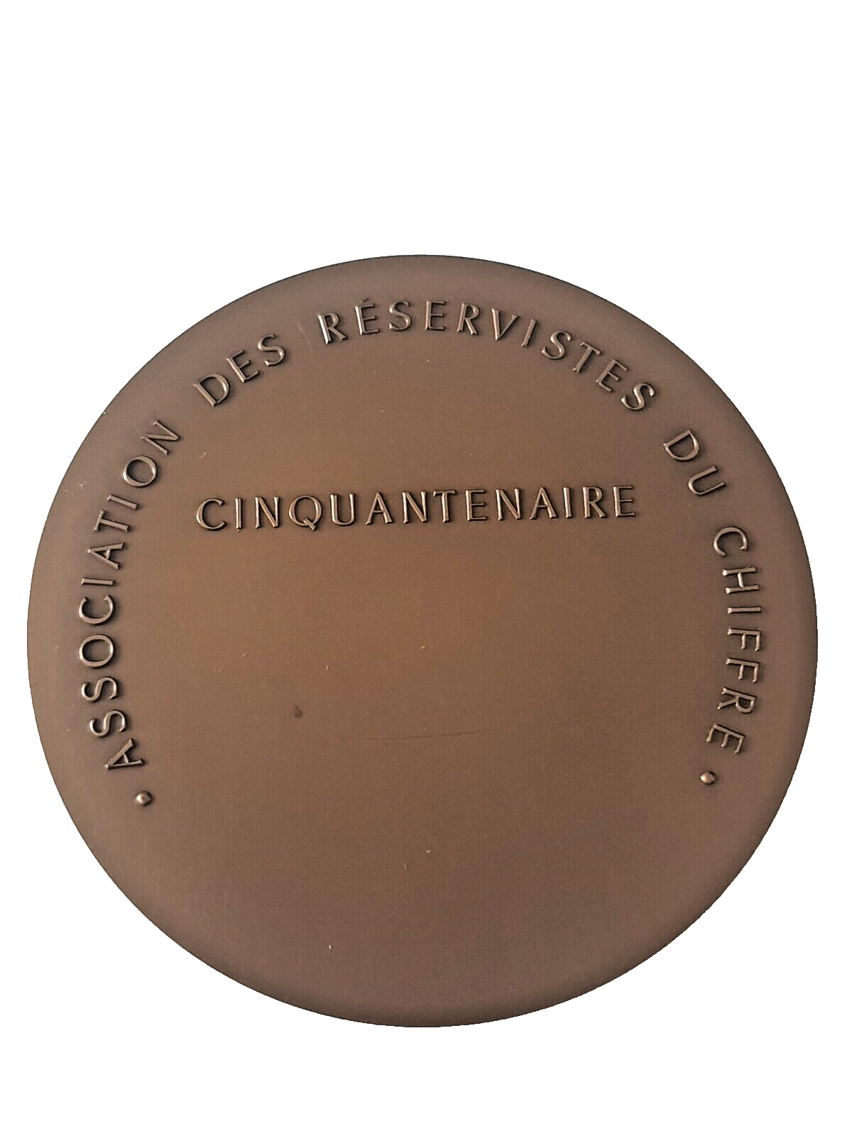 Medallion commemorating the 50th anniversary of the "Association Des Réservistes du Chiffre" (1929-1979). | This association is now known as ARCSI (Association des Réservistes du Chiffre et de la Sécurité de l'Information). Here is a photo of the other side of the medallion. | Here is a webpage titled De l'insigne du service du chiffre à l'insigne des spécialités SSI for excellent background information on these badges/insignas in France. |