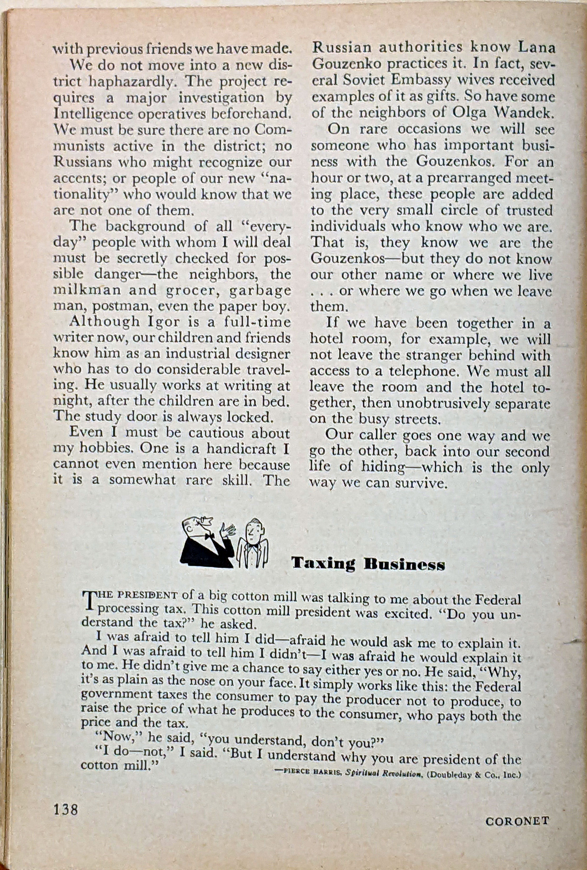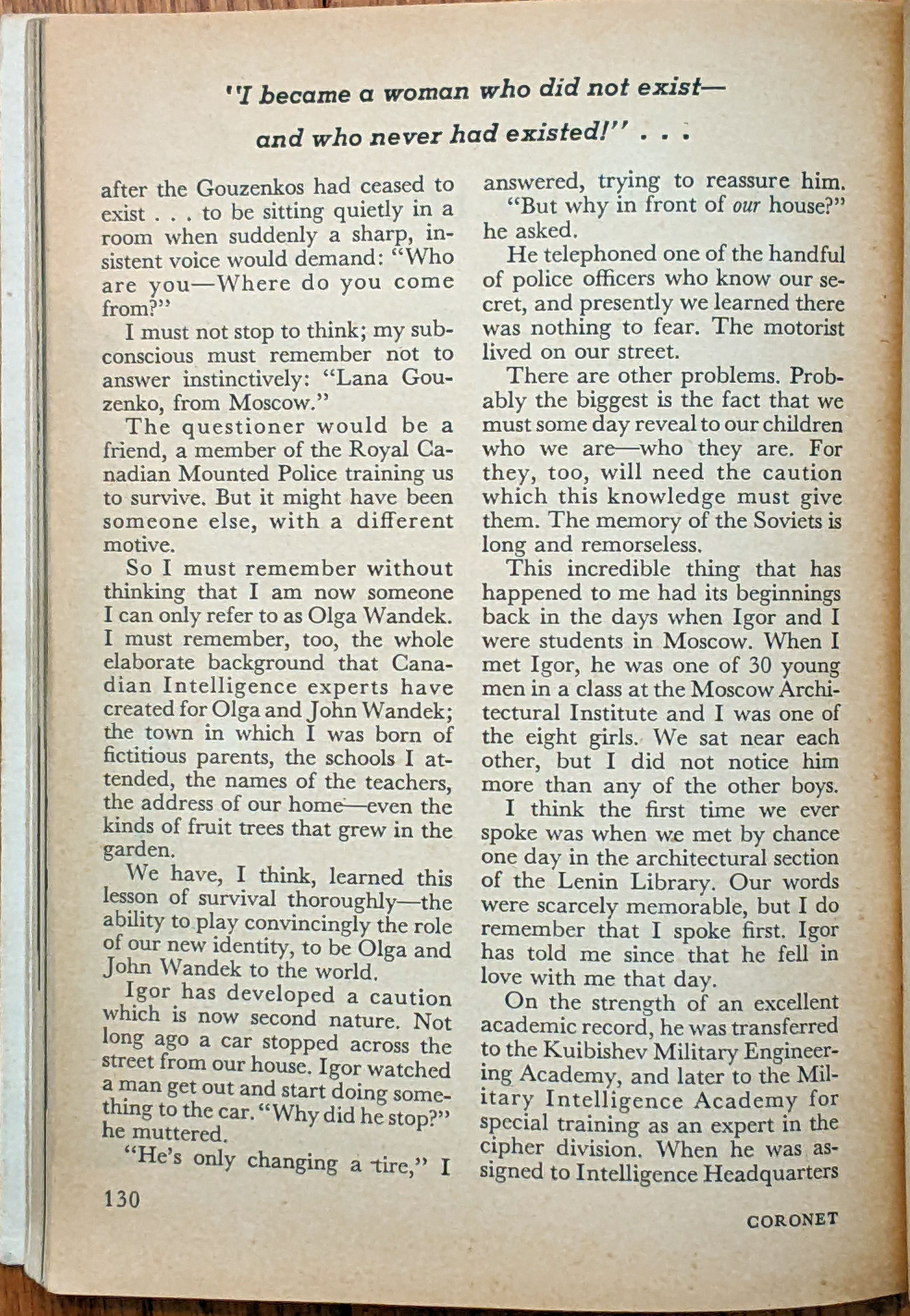This was an 8-page article (by Igor Gouzenko as told to Anne Fromer) in the Coronet magazine. The foreword is as follows: "Late one night in the code room of Soviet spy headquarters for North America, Igor Gouzenko put a carefully prepared plan into action. He slipped 109 secret documents into the lining of his coat. Then he walked out of the building - the Soviet Embassy in Ottawa - for the last time. Why did Gouzenko voluntarily change his allegiance to democracy? What single incident convinced him that the Soviet cause he was serving was false? In this article, are the answers. Here, for the first time, Igor Gouzenko tells the story of one of the most sinister adventures of our time" - The Editors." Here are all pages scanned for your reading benefit: |