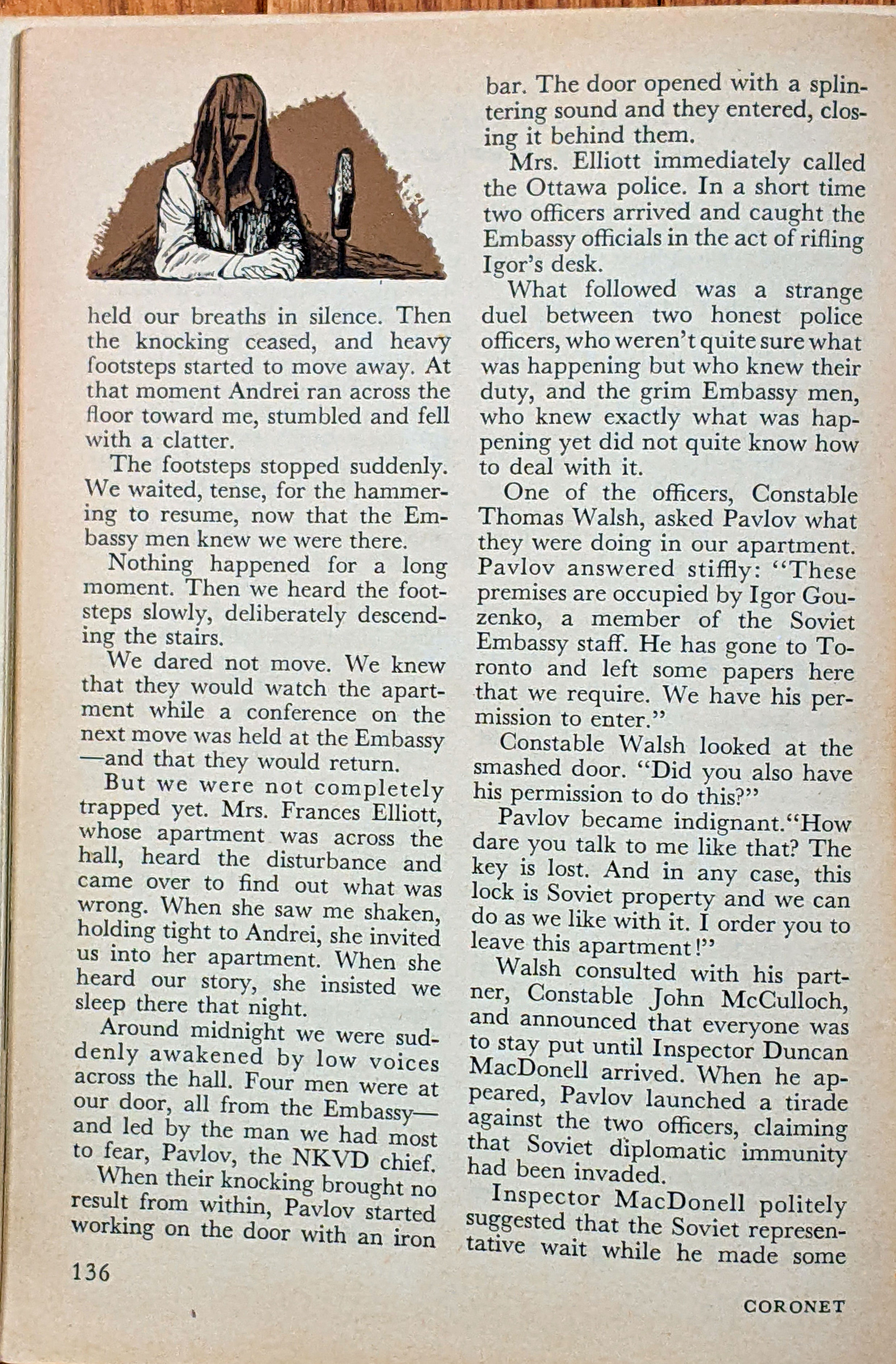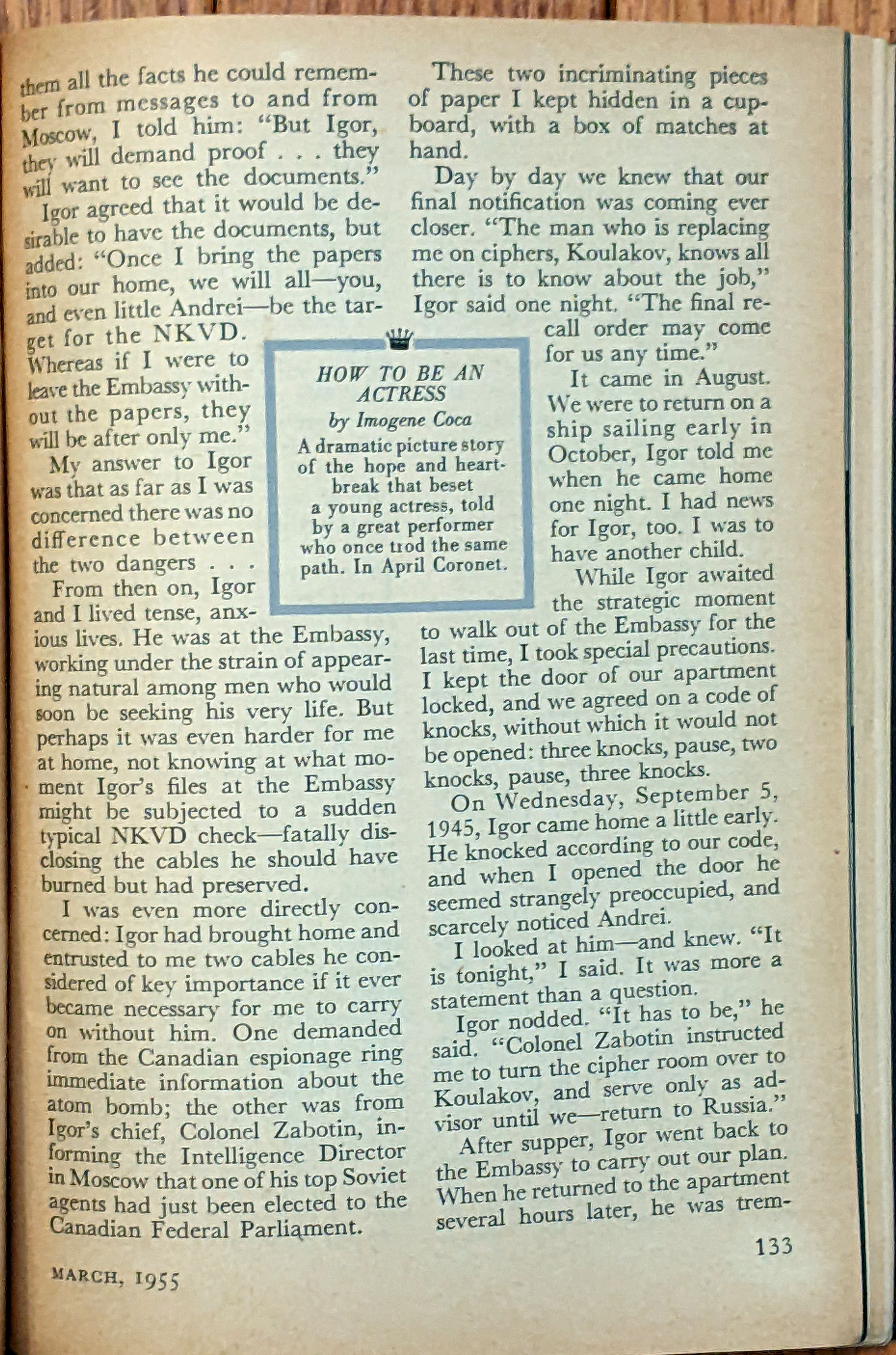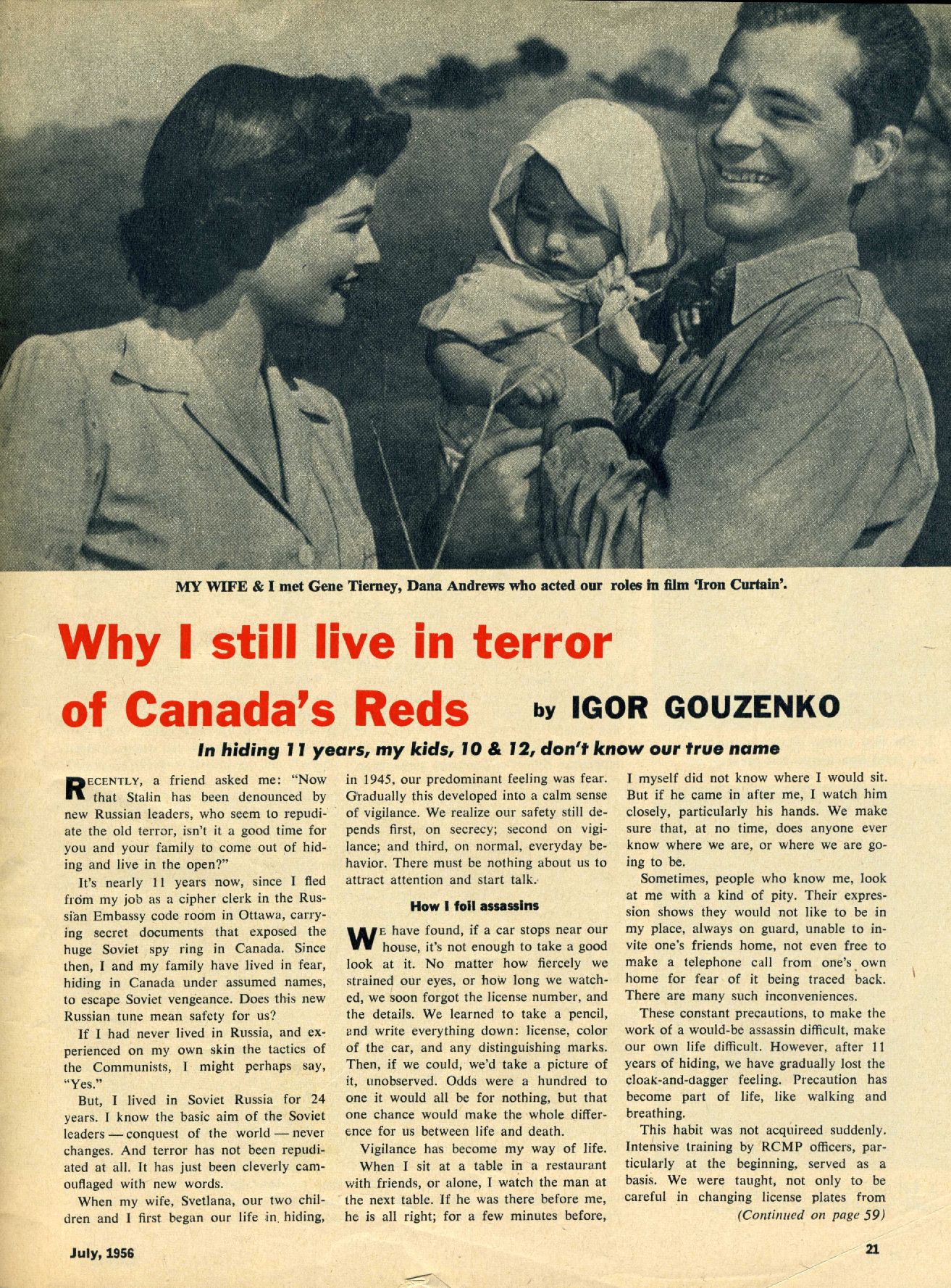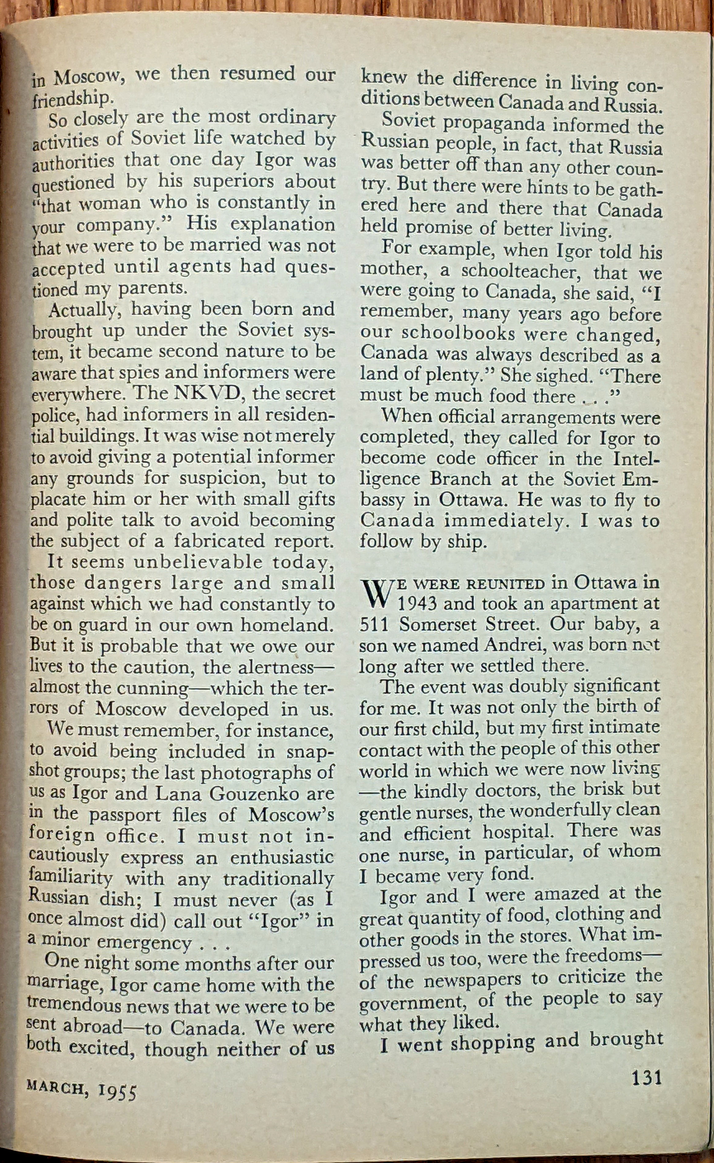 This was an 10-page article (by Lana Gouzenko as told to Anne Fromer) in the Coronet March 1955 magazine. The foreword is as follows: "Drama and fear must forever walk hand in hand with this exiled Russian family" Here are all pages scanned for your reading benefit: |