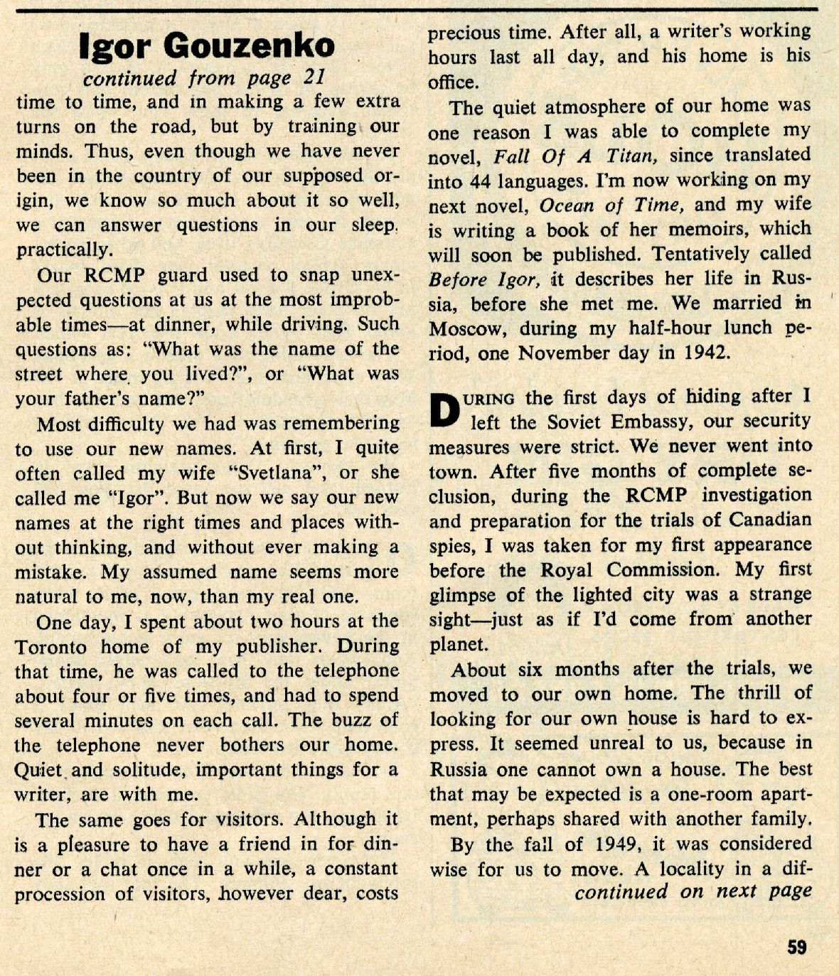 Magazine article on the new release of Igor Gouzenko's new book "The Fall of a Titan". The cover of the magazine has a photo in which the manacled hands symbolize the bleak enslavement of honor and culture behind the Iron Curtain, the theme of Igor Gouzenko's new panoramic novel, "The Fall of a Titan". Here is a scan of the page (10) featuring the article. There is also a column on the author Igor Gouzenko written by Bernard Kale: The Author Igor Gouzenko began his career as a front-page disgrace to the Kremlin in September 1945, only a month after Hiroshima. Gouzenko, a twenty-six-year-old graduate of Moscow's Military Intelligence School, had spent two years as a code clerk in the Soviet Embassy in Ottawa when he decided to walk out on the USSR with 109 documents stuffed under his shirt. Unwrapped, these reports and memorandums represented the first pieces of evidence of a Soviet atom spy ring in North America. They disclosed that Dr. Allan Nunn May, a physicist whose subsequent conviction led to Fuchs and the Rosenbergs, had tipped off the Russians about our A-bomb experiments and had even passed along a sample or two of uranium. As for Gouzenko, he, his wife and their two children were promptly absorbed into Canada's day-to-day life under assumed names (his boy and girl don't even know they are little Gouzenkos). Someone from the Royal Canadian Mounted Police is always within shouting distance, just in case. In his disguise, as just another Iron Curtain refugee, Gouzenko became a writer and, "somewhere in Canada" the other day, he discussed how he'd gone from dabbling in short stories in his youth to "The Fall of a Titan". "When I was a pupil in Russia I wrote good compositions," he began proudly. "one about a boy becoming a famous violinist was particularly praised by my teachers. I was then in the fifth grade, about eleven years old." His memoirs, "The Iron Curtain", followed in 1948 when he was about twenty-nine. He spent four years on "The Titan" - one looking for a subject, three in the writing. It was turned down by a half-dozen American publishers before Norton accepted it last fall, unaware that Igor Gouzenko was the Igor Gouzenko. Not long afterwards the Jenner Committee went to Canada to discuss the espionage business with Gouzenko, and his picture appeared in the front pages. His head was in a hood. |