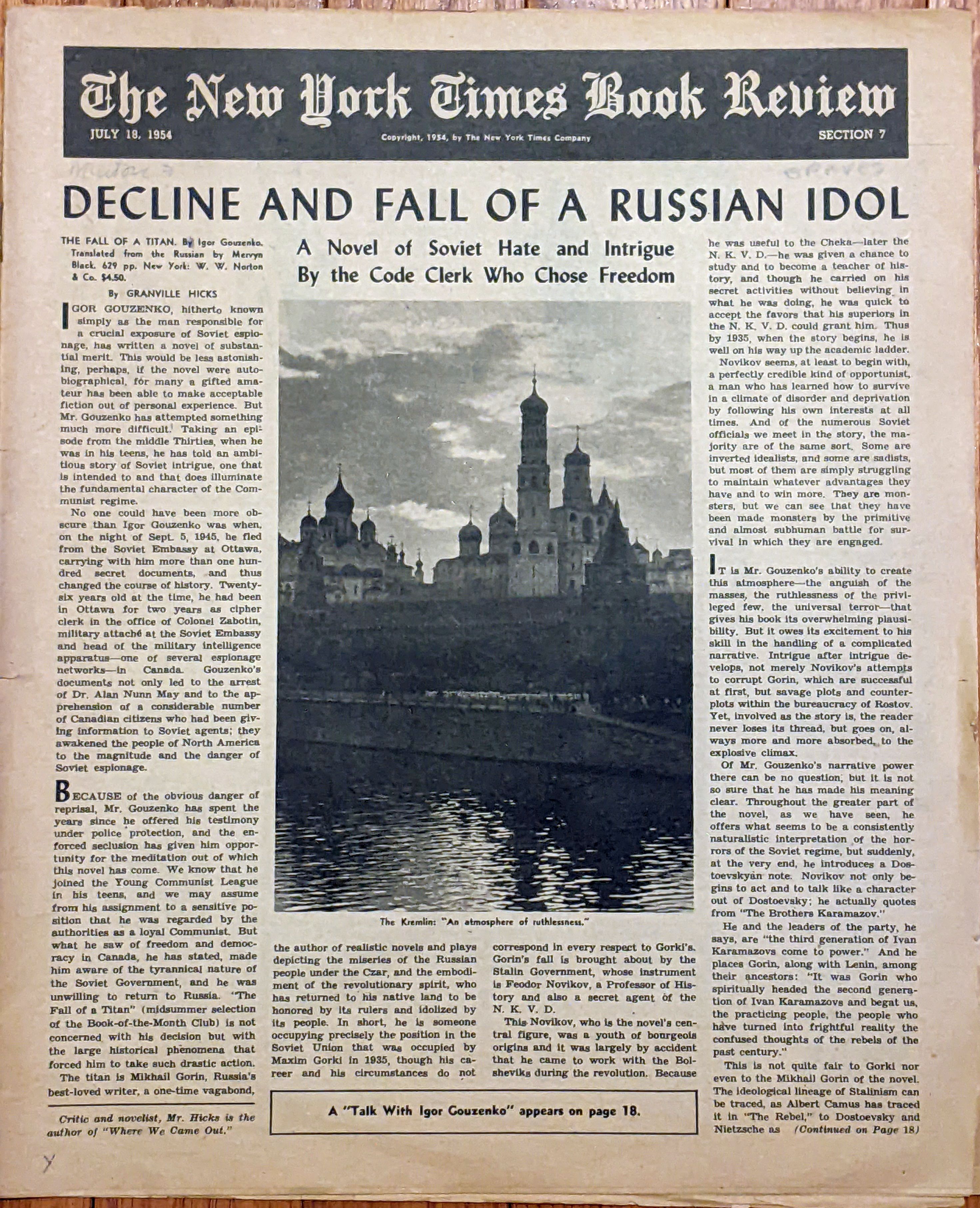 This issue of The New York Times Book Review (18 July 1954) contains an article involving Igor Gouzenko. |