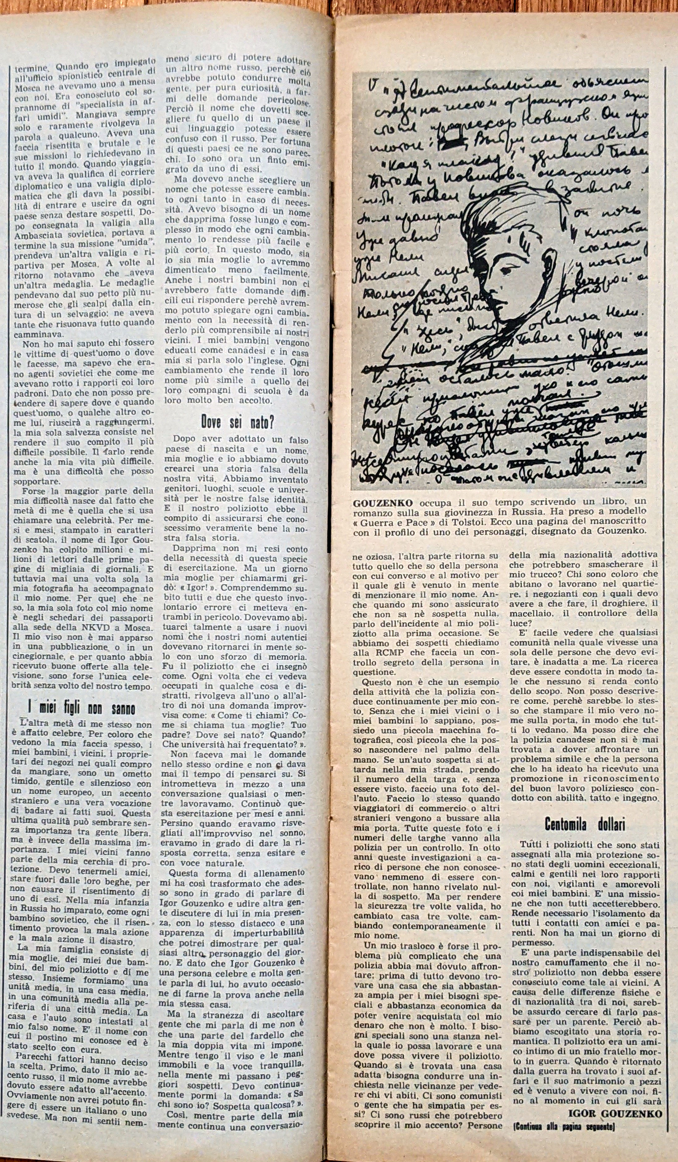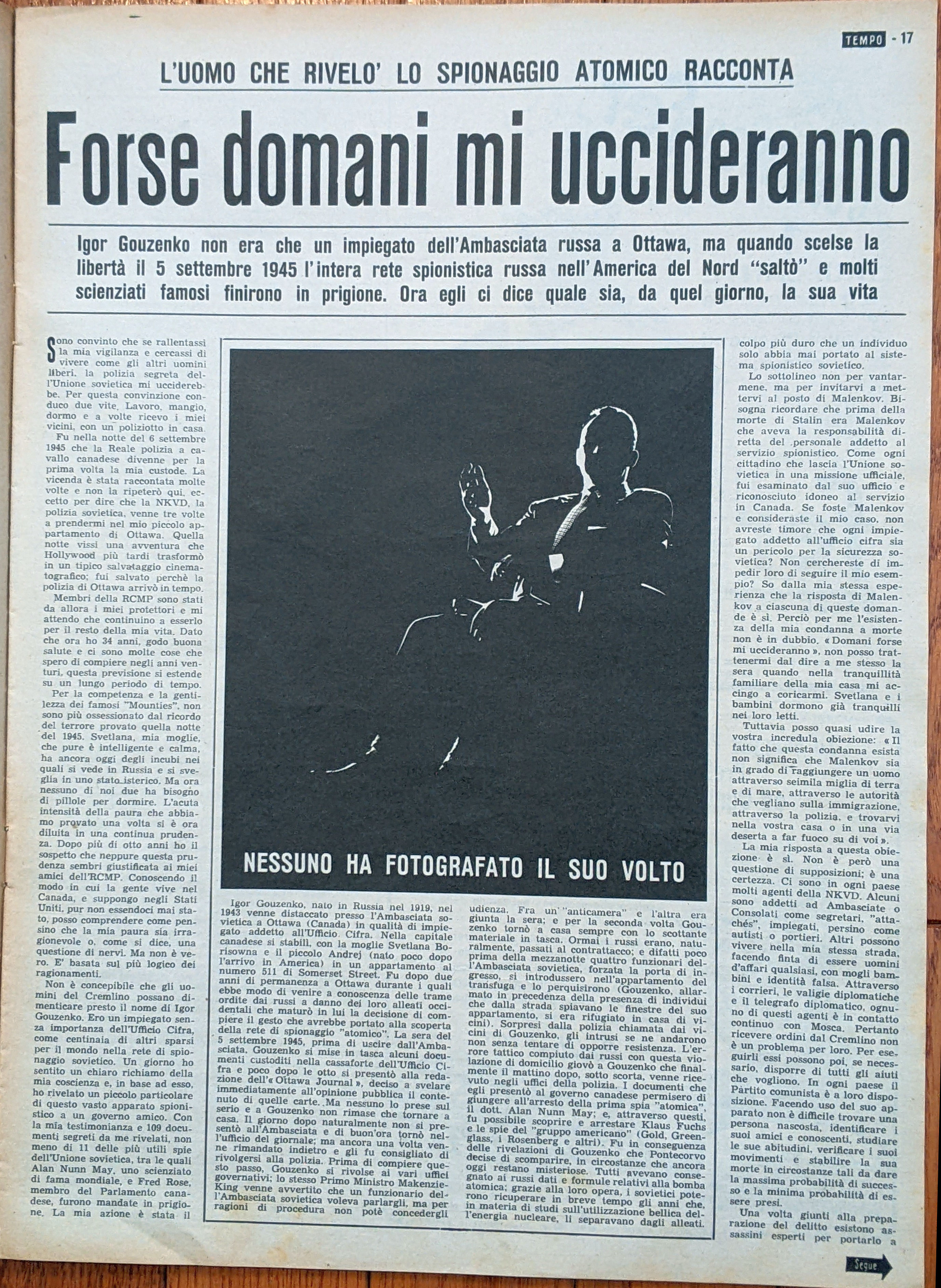This Italian issue of Tempo magazine (24 March 1954) features an interview with Igor Gouzenko. | The title of the article is "Forse domani mi uccideranno" or in English "Maybe Tomorrow They Will Kill Me".